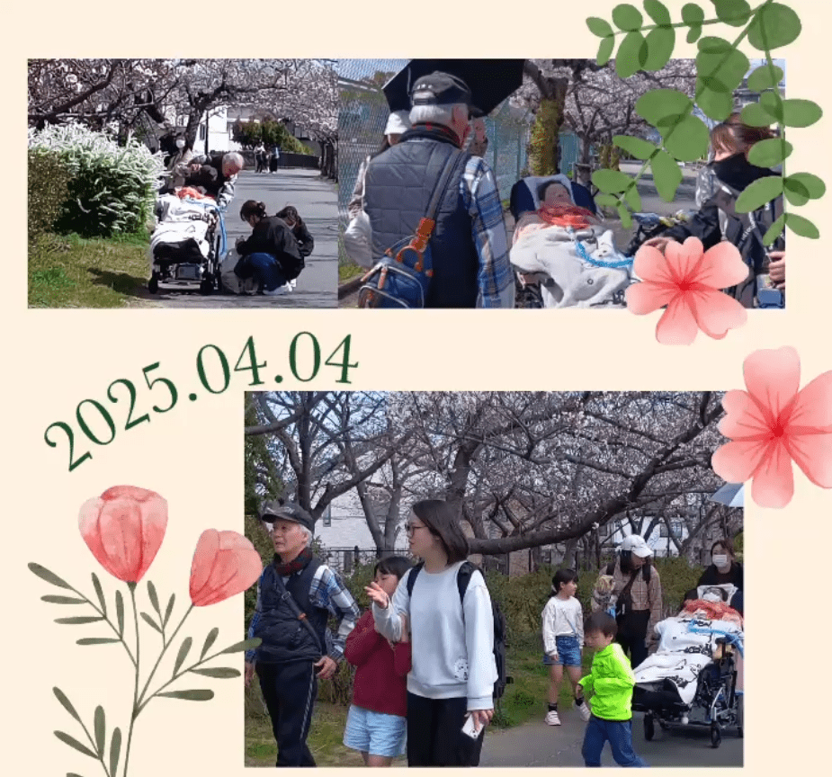 弊所の介護スタッフが付き添い、穏やかな春の空気に